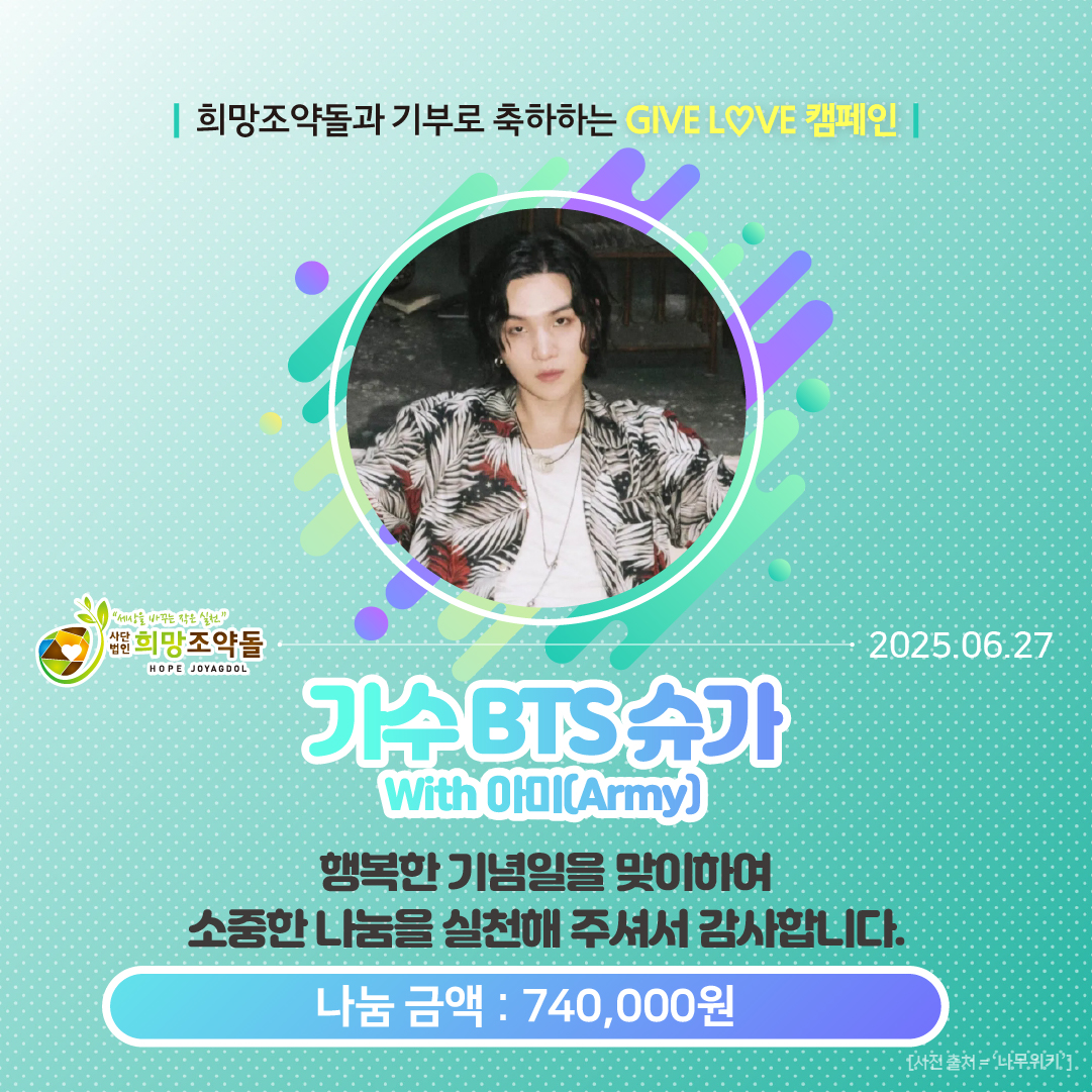 팬분들의 뜨거운 응원 덕분에, 슈가님의 이름으로 미혼모가정에게 뜻깊은 후원이 전달되었습니다.