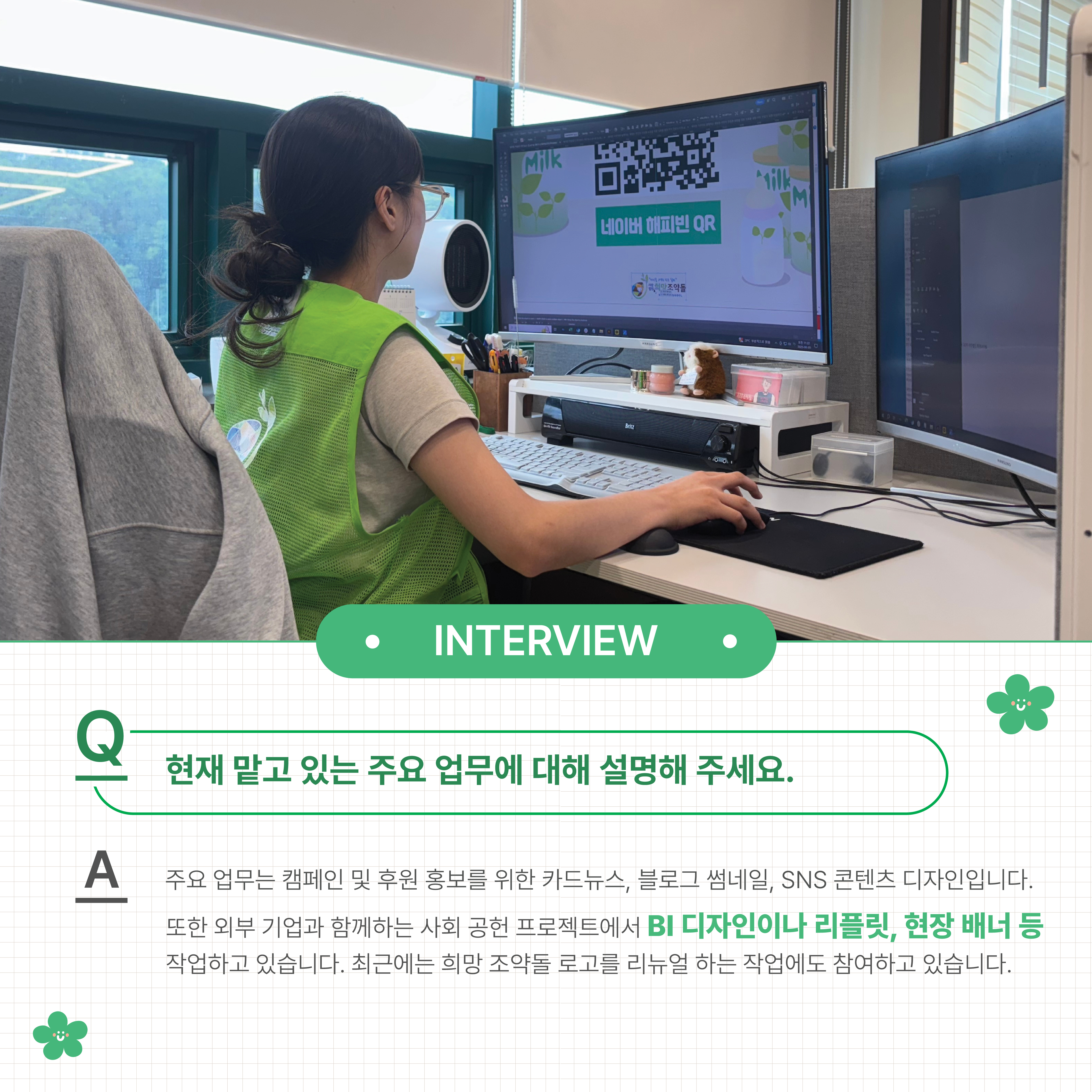 주요 업무는 캠페인 및 후원 홍보를 위한 카드뉴스, 블로그 썸네일, SNS 콘텐츠 디자인입니다.