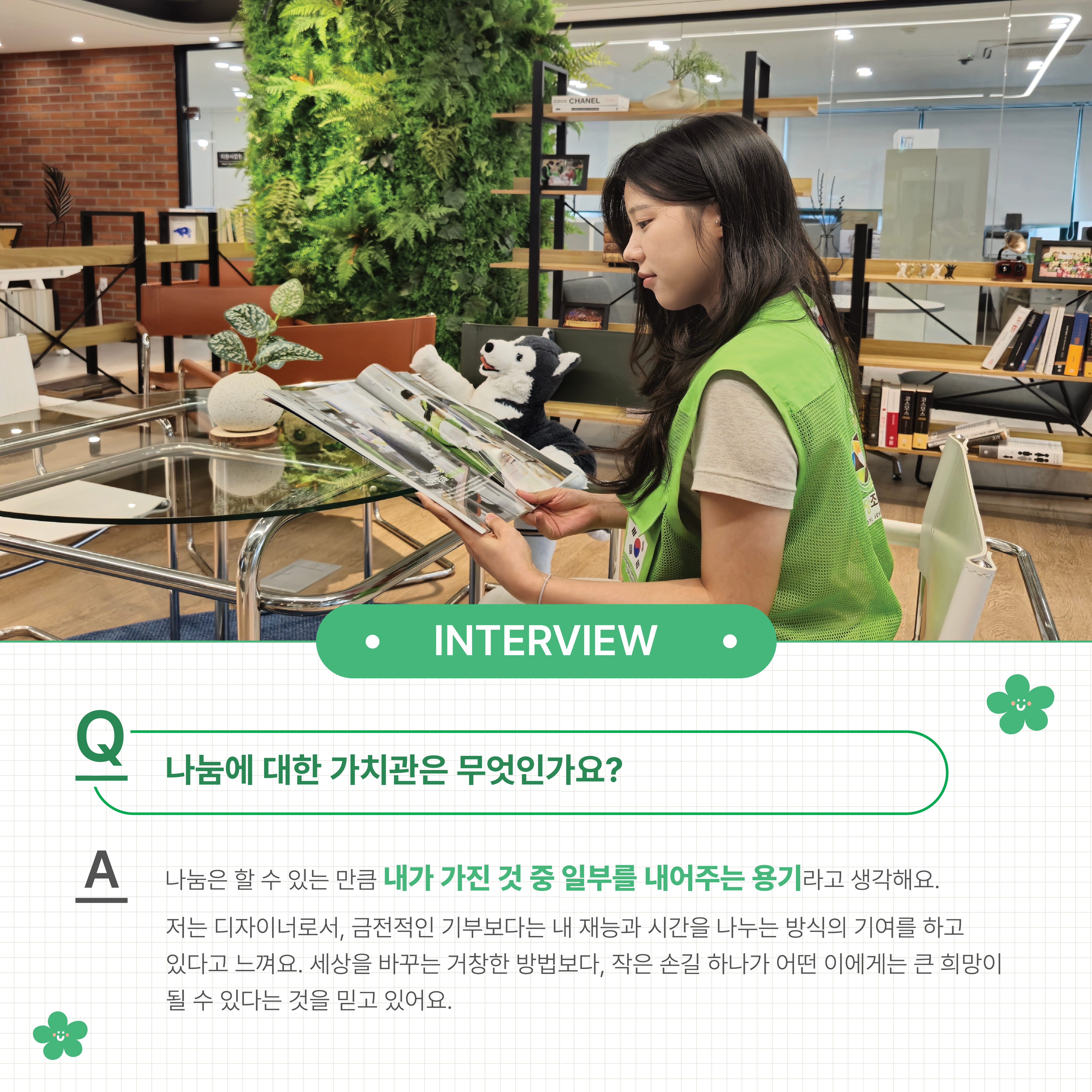 저는 디자이너로서, 금전적인 기부보다는 내 재능과 시간을 나누는 방식의 기여를 하고 있다고 느껴요.