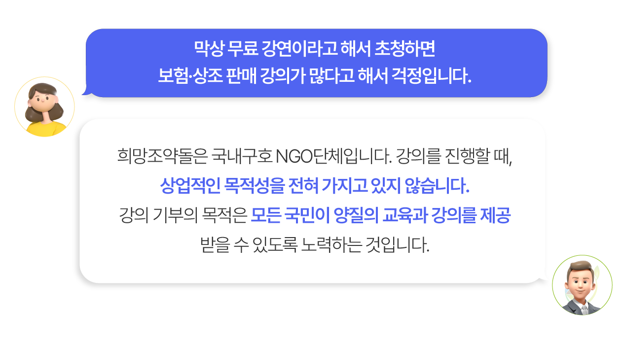 막상 무료 강연이라고 해서 초청하면 보험·상조 판매 강의가 많다고 해서 걱정입니다.