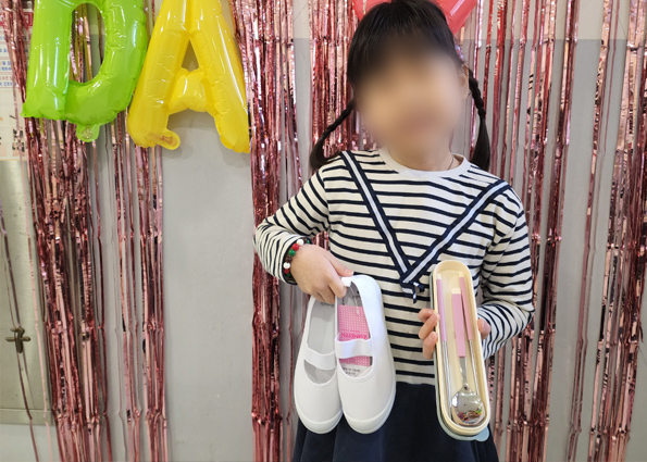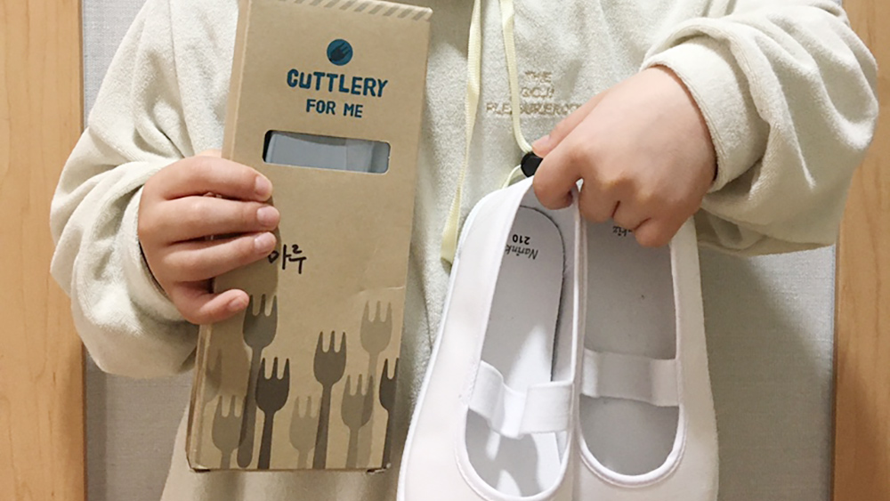새하얗고 작은 실내화를 신고 새로운 세상을 맘껏 누비며 얼굴에 웃음이 떠나질 않기를, 새 수저세트와 함께 좋아하는 친구들과 건강한 음식을, 건강한 마음을 나누어 먹기를 바래봅니다.